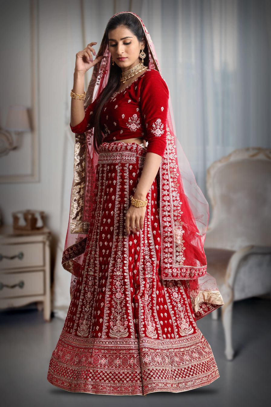 Maroon velvet embroidery work lehenga