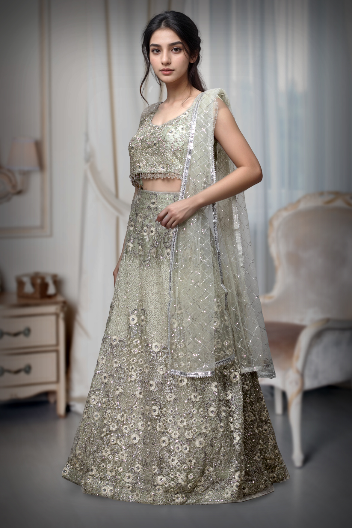 Save 71%Sage Green Crop Top Lehenga With Heavy Detailed Skirt With Floral Designs And Sleeveless Blouse