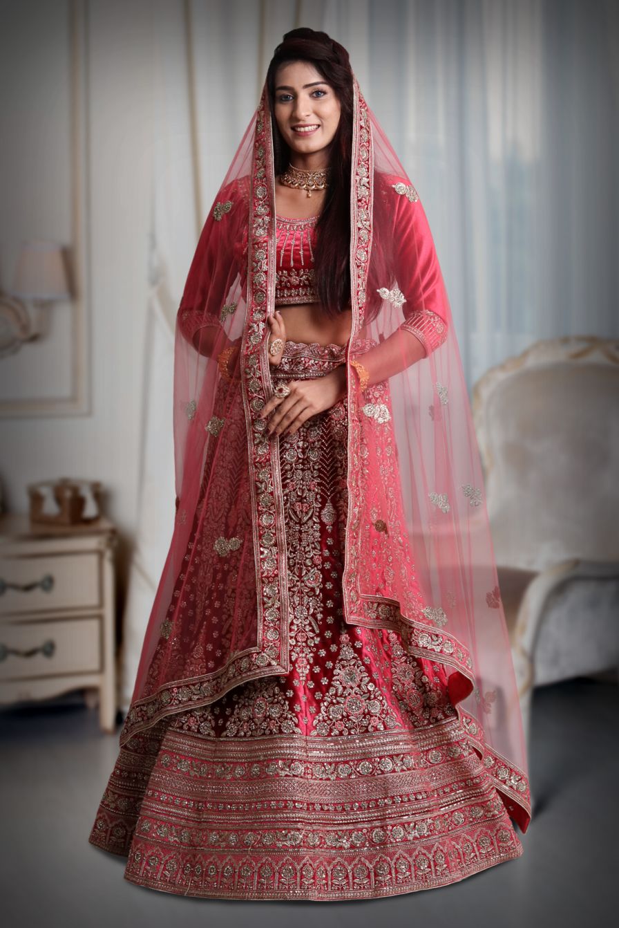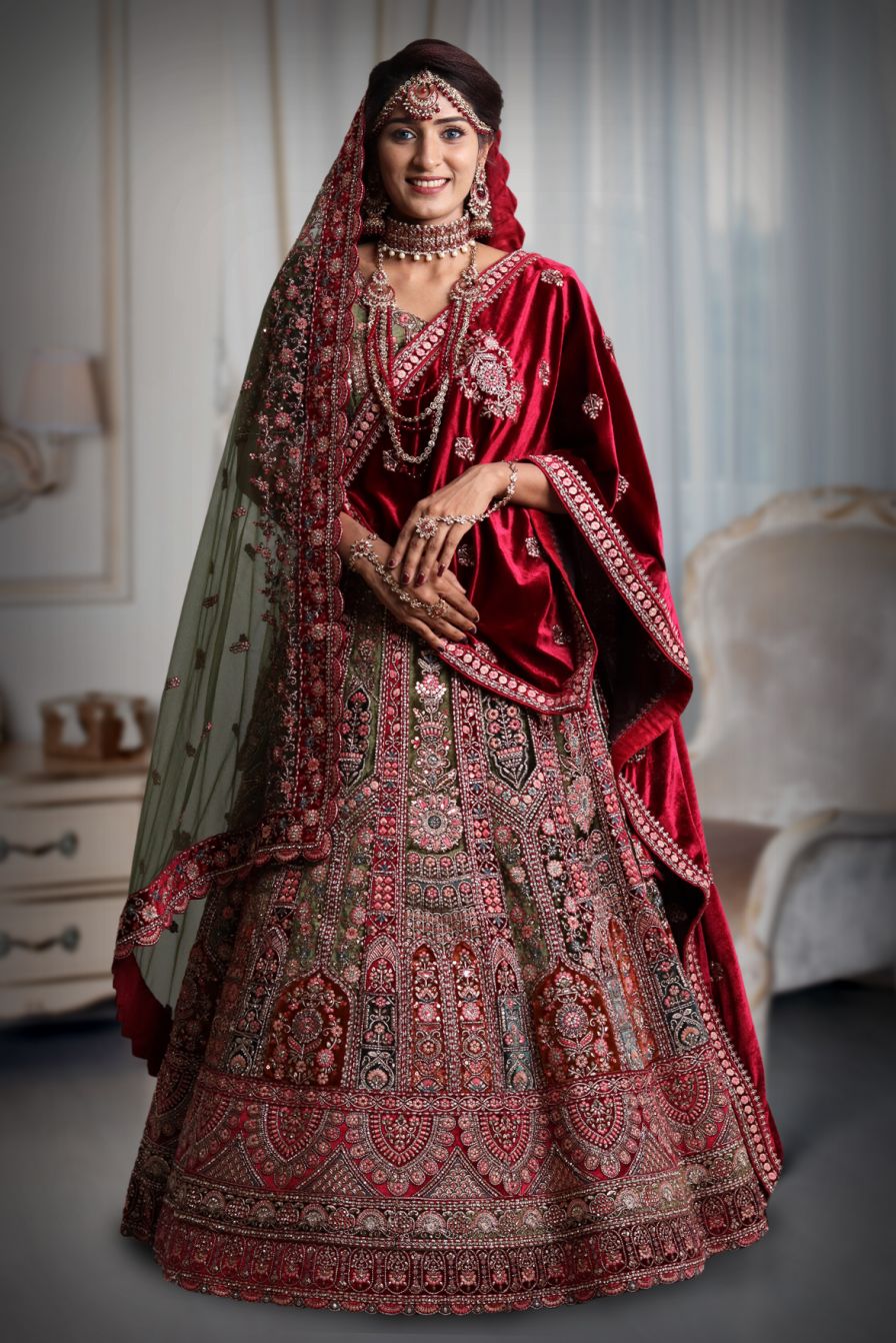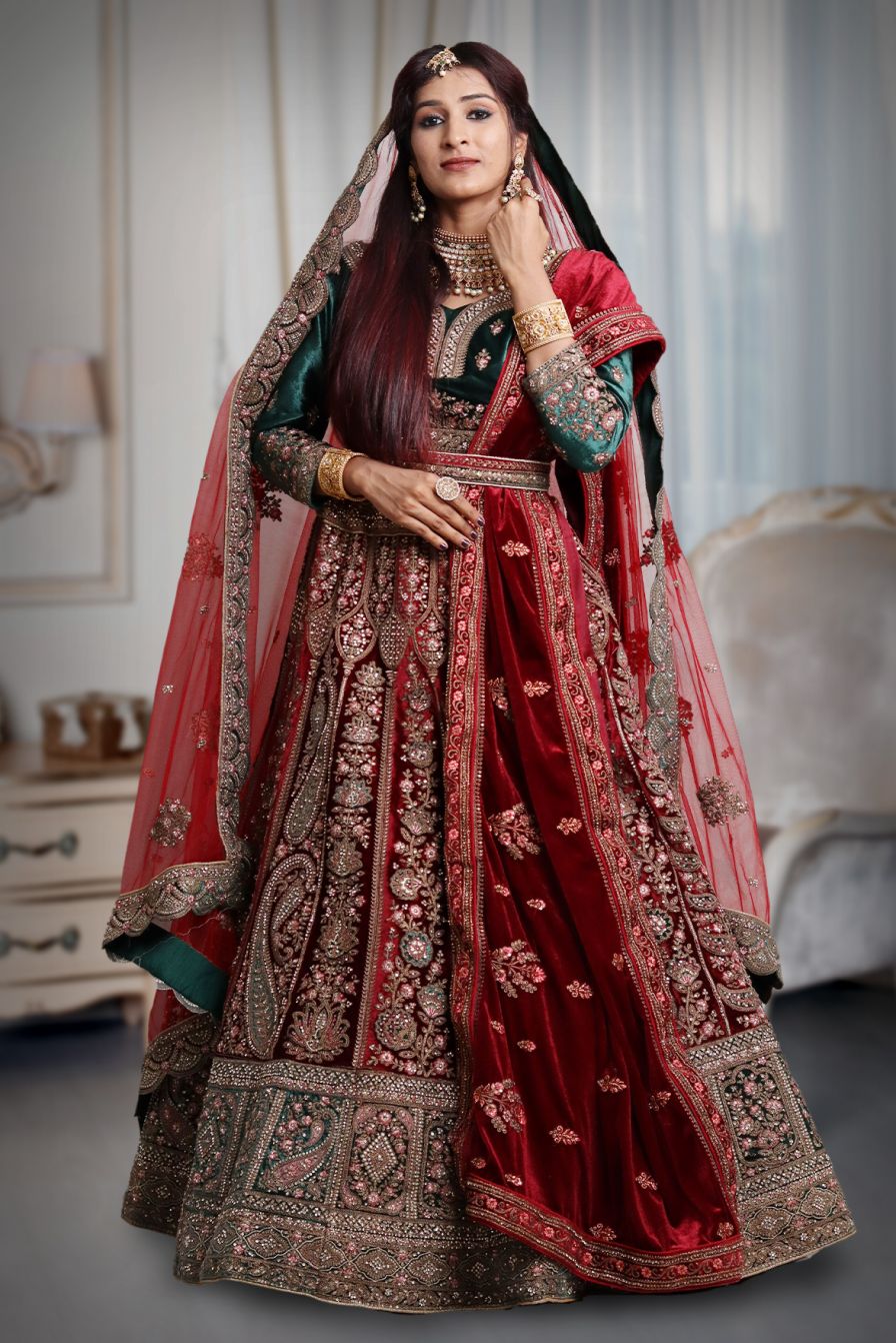 Red and green velvet heavy work lehenga