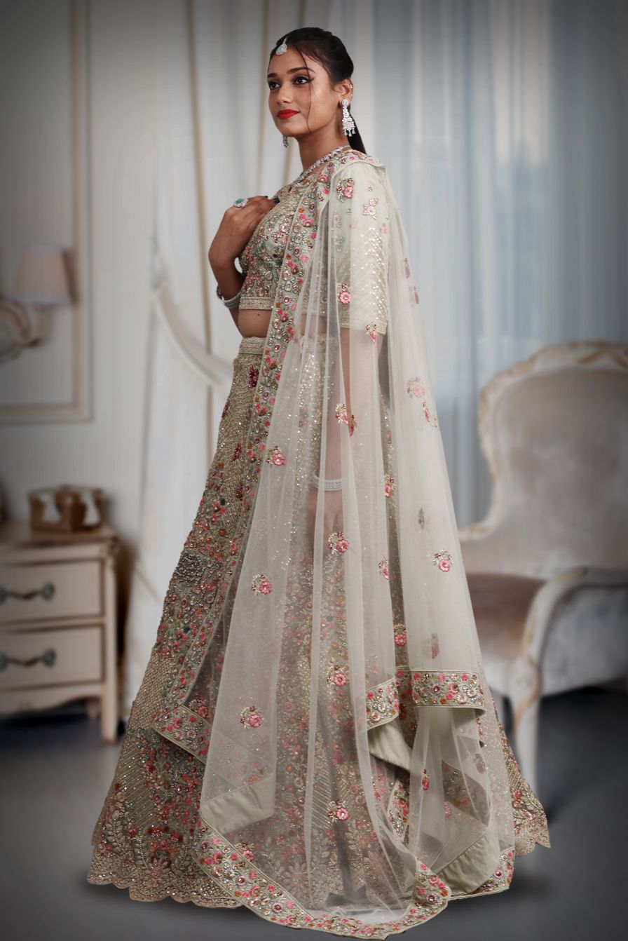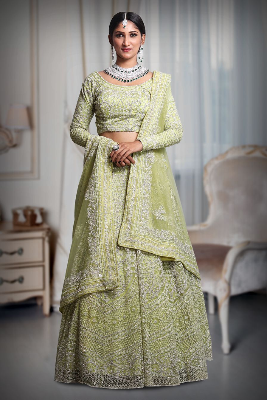 Pista green heavy thread work and jarkan stone work lehenga