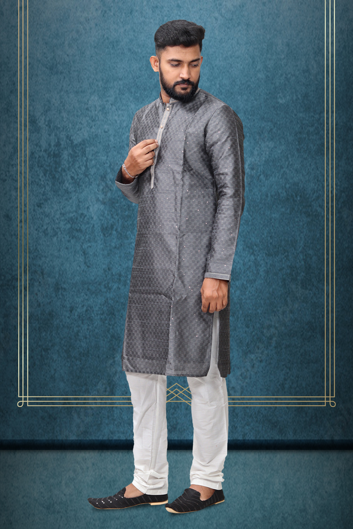 Save 80%Grey Colour Ethnic Kurtha In Golden Threadwork Textured Dupion Silk Fabric And White Bottom