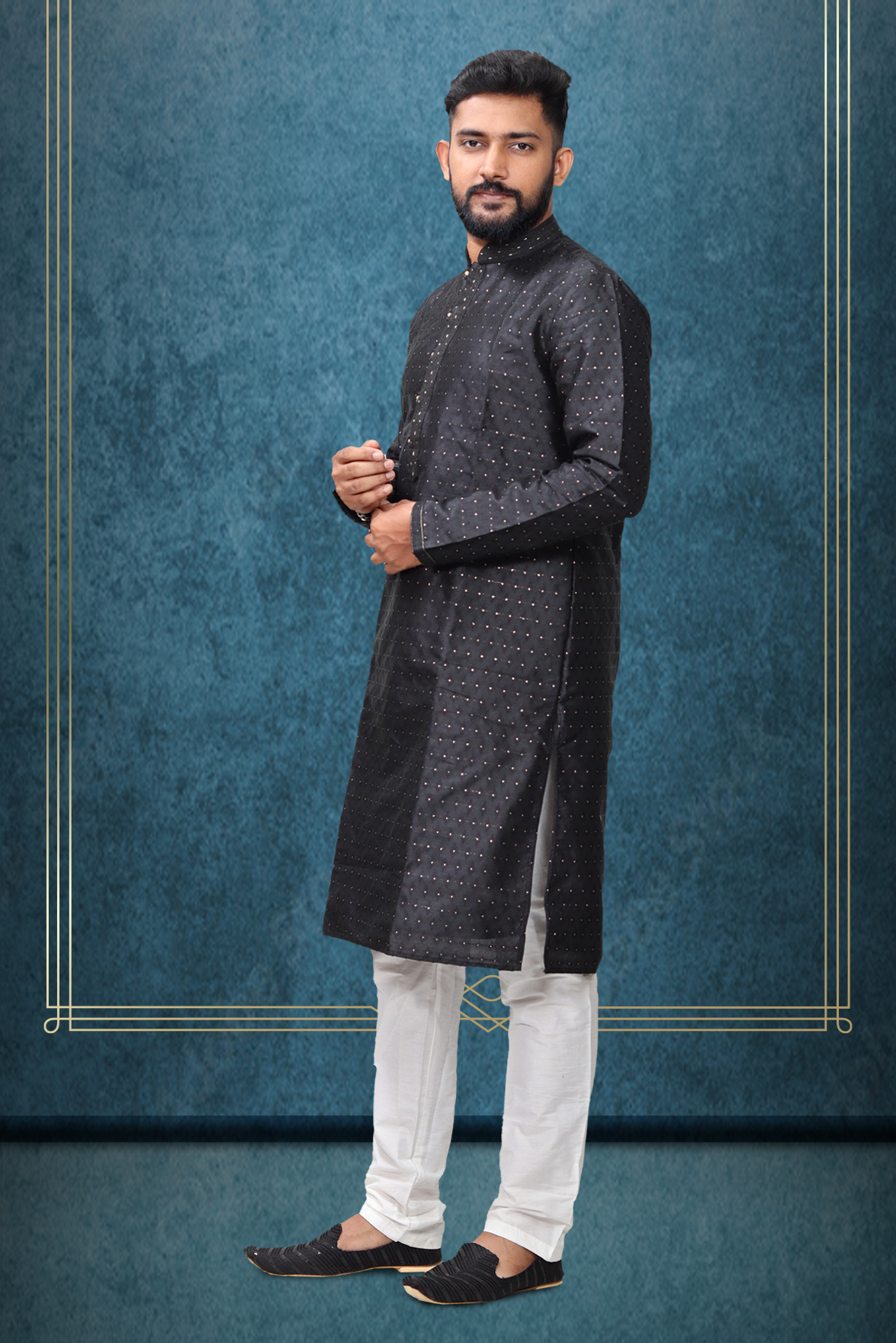 Save 80%Black Colour Ethnic Kurtha In Golden Threadwork Textured Dupion Silk Fabric And White Bottom