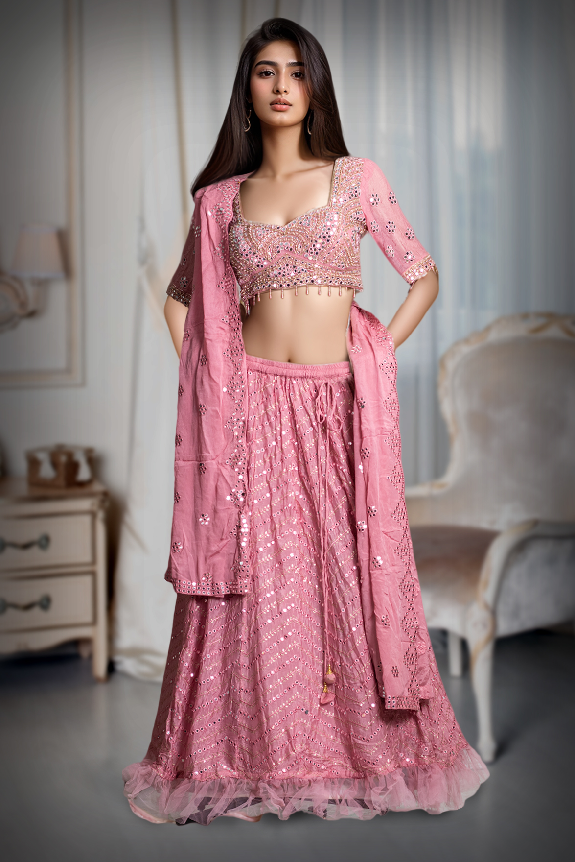 Save 85%Dark Peach Georgette Heavy Worked Lehenga With Same Colour Blouse and Dupatta