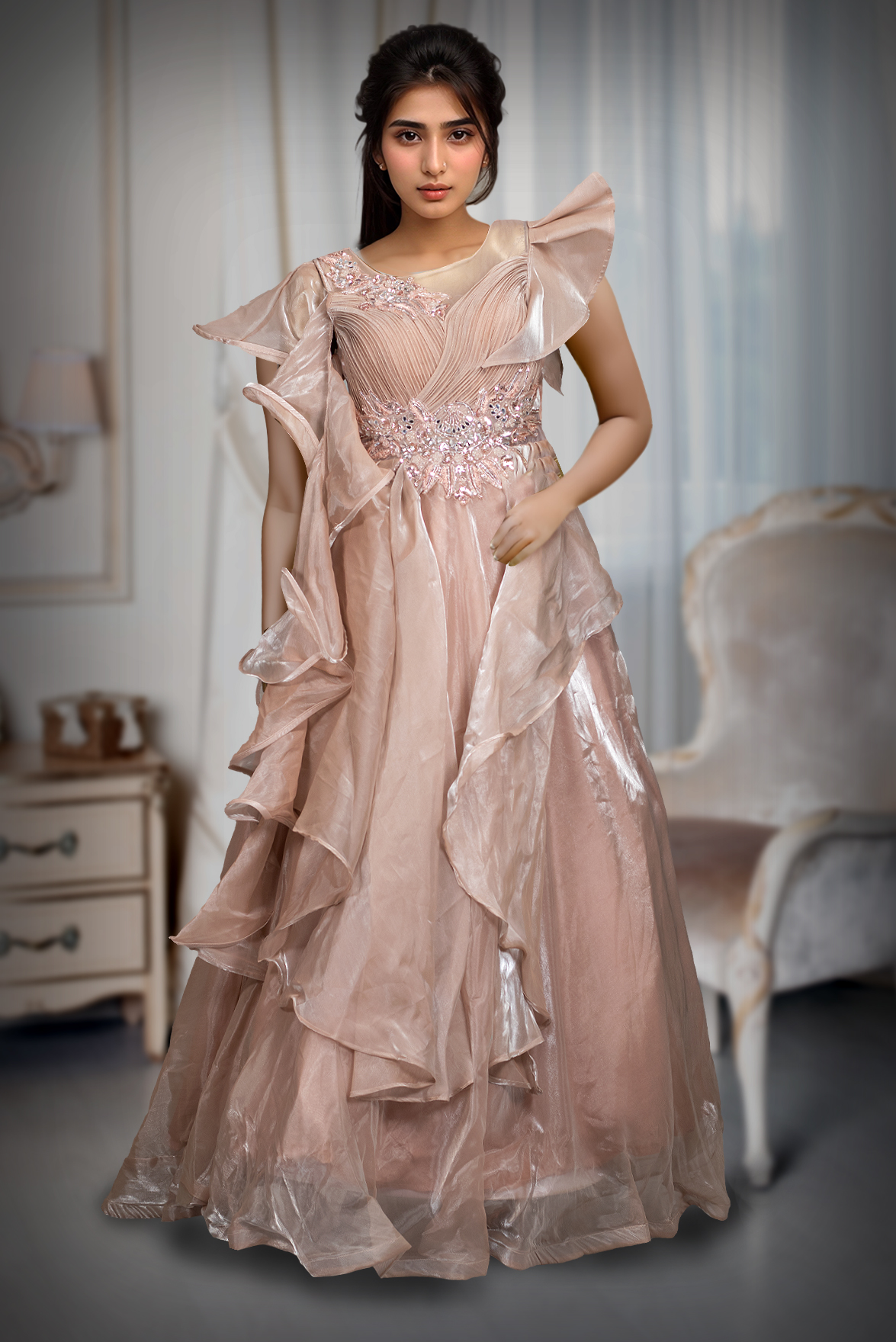 Save 84%Almond Beige Colour Heavy Work Crushed Drapping Gown With Heavy Embellishment on left Shoulder And Yoke