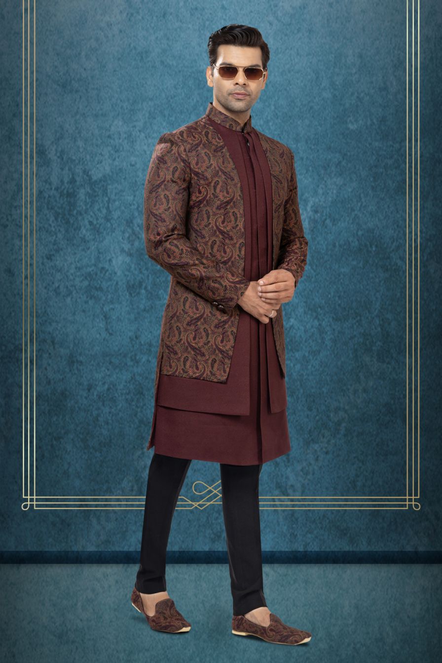 Save 75%Maroon Silk Kurta with Brown Paisley Brocade Indo-Western Sherwani