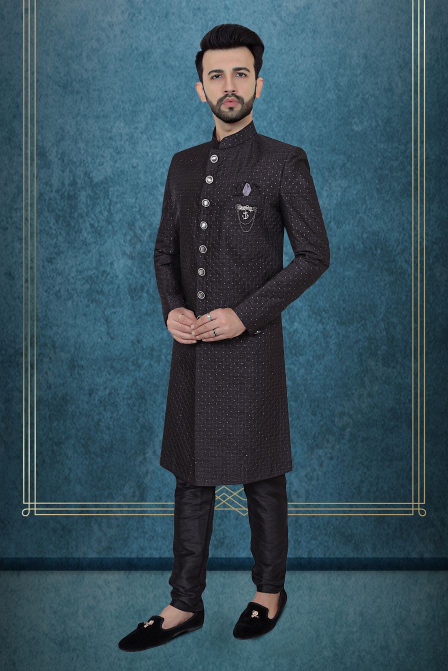 Save 78%Black Textured Jacquard Sherwani with Silver Buttons