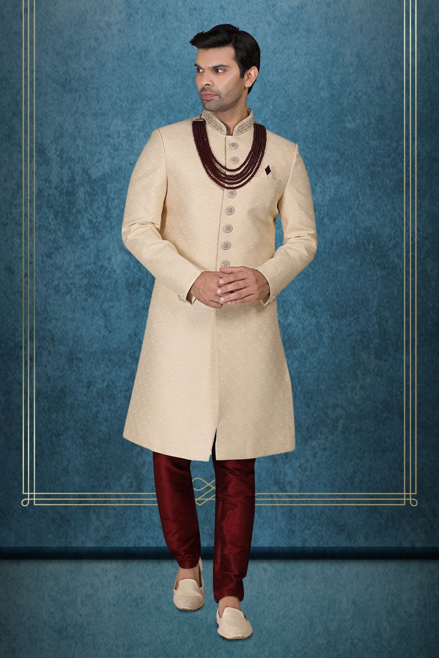 Save 77%Classic Cream Textured Sherwani with Maroon Beads
