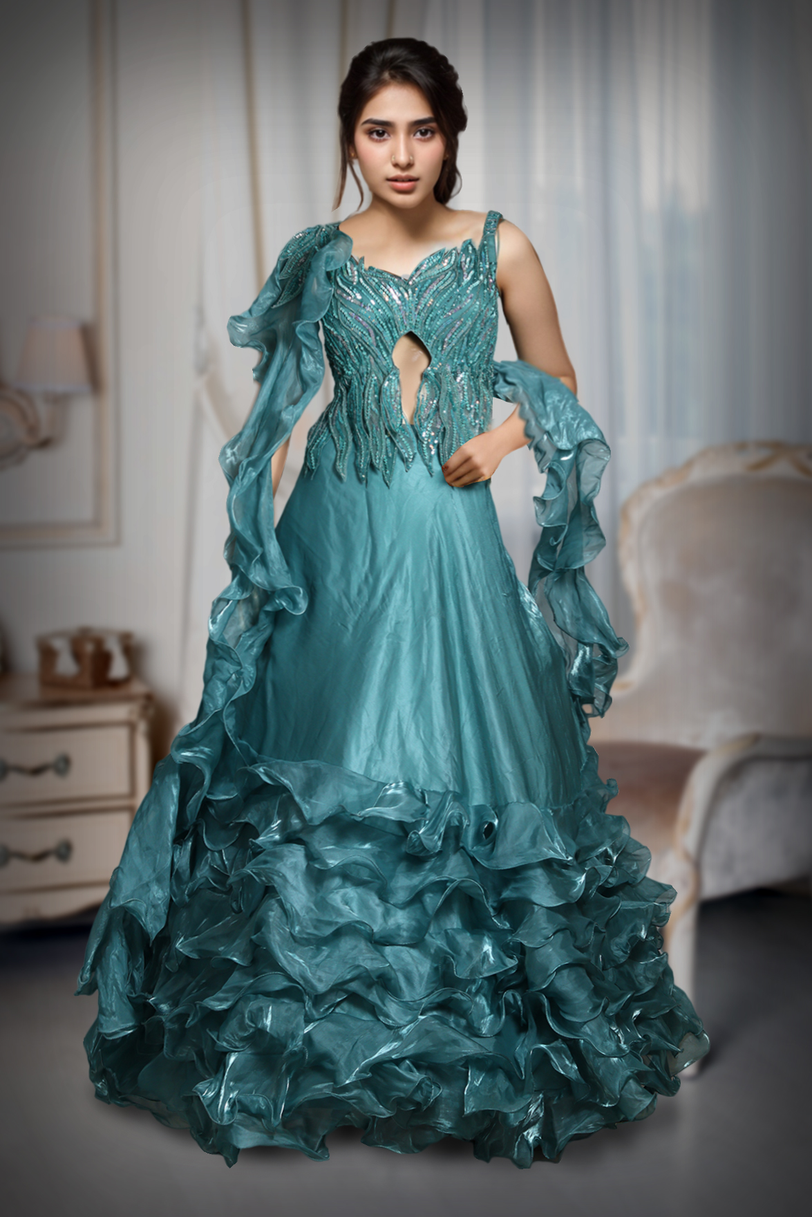 Save 85%Cyan Blue Tissue Silk Lehenga With Heavy Stone Worked Blouse And Ruffle skirt