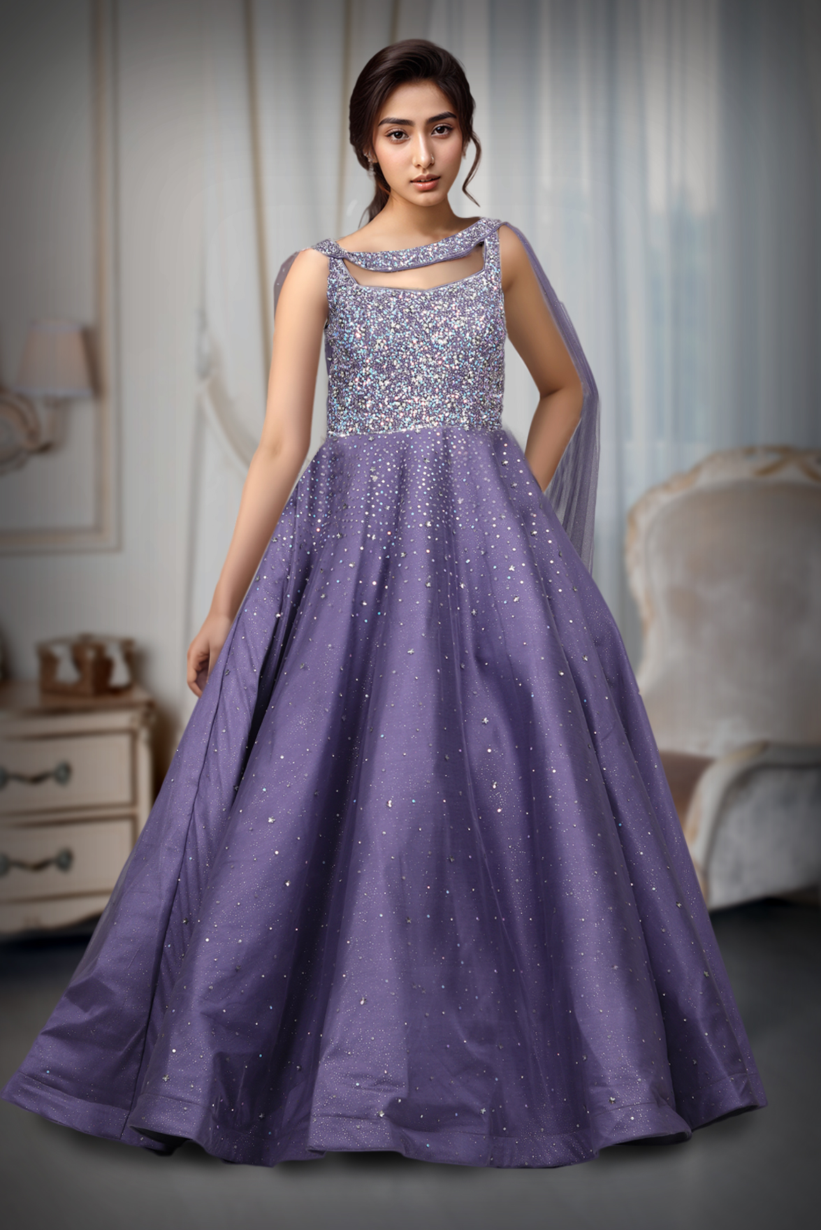 Save 87%Blue Lilac Exquisite Gown With Neckline Detailing And Rainbow Textured Work On Center Front