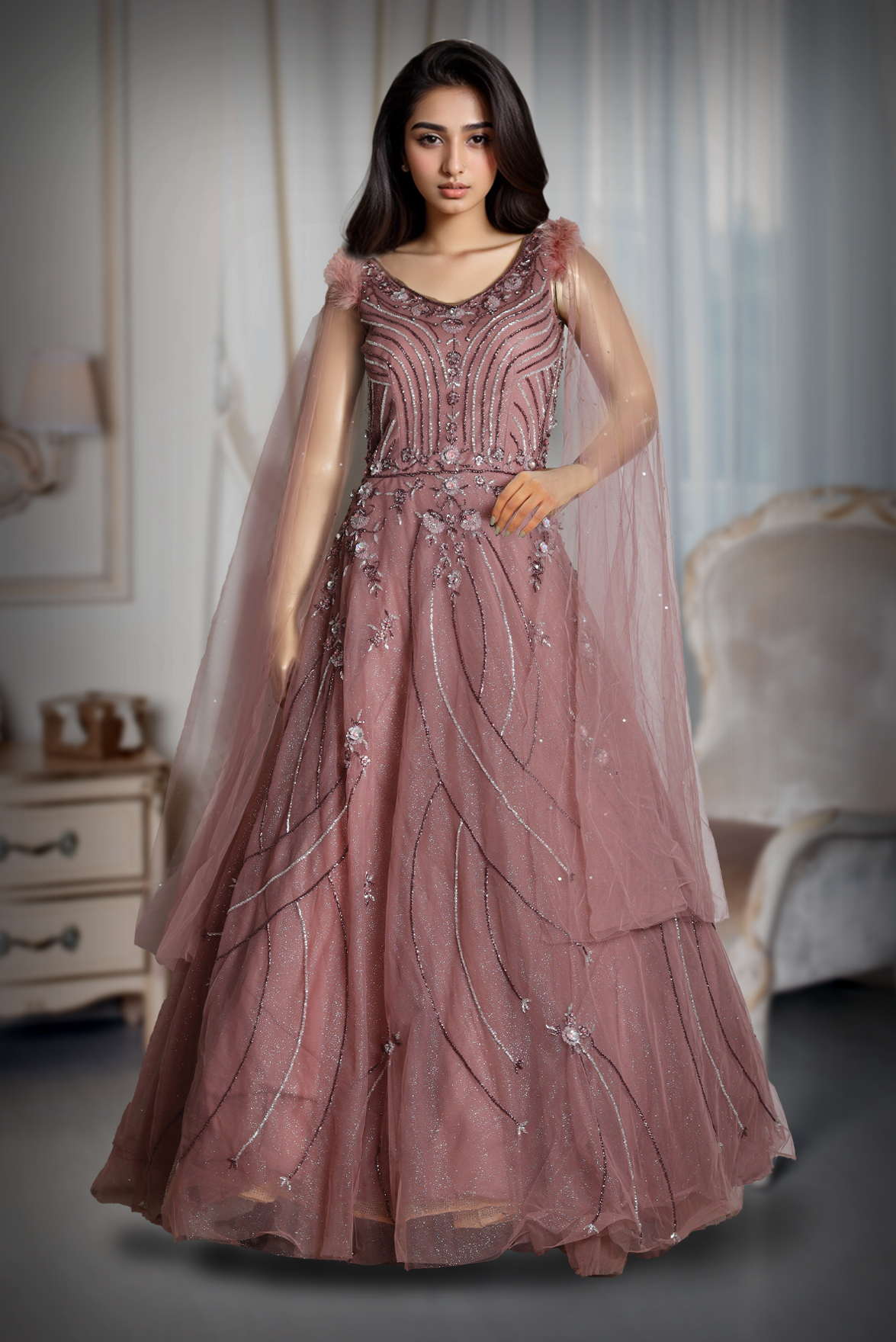 Save 85%Dark Mauve Heavy Net Gown With Heavy Handwork Details And Shoulder Embellished With Feathers