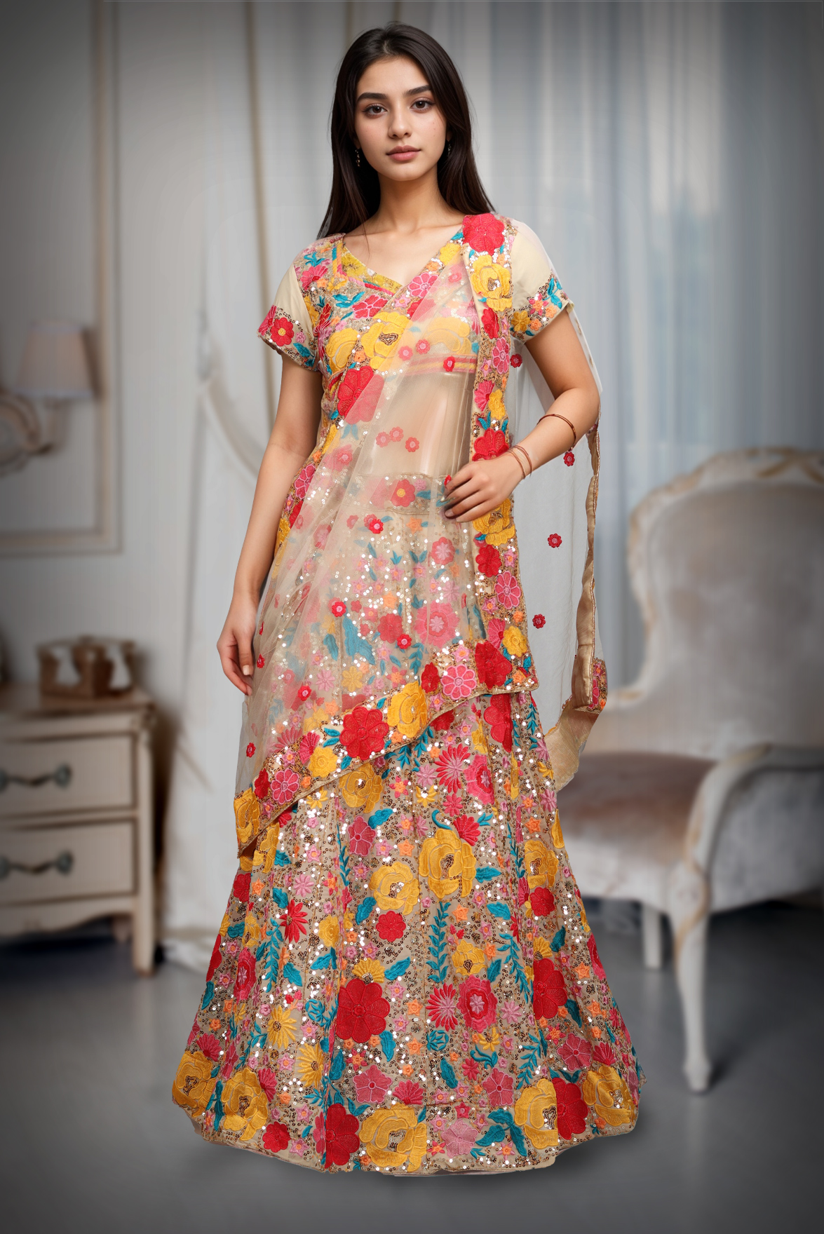 Chikoo Multicolour Threadwork Floral Lehenga