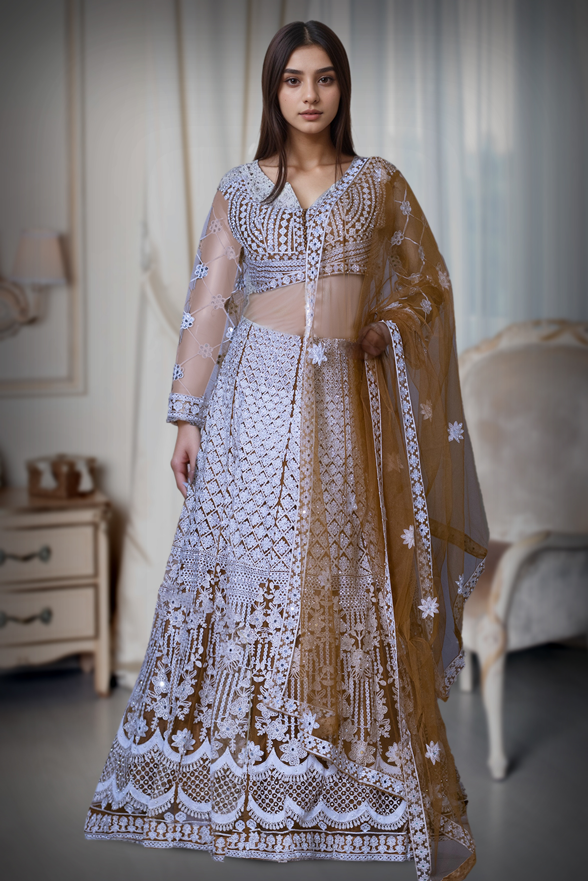 Save 76%Heavy Threadworked Net Frill Royal Gown With Detailed Sleeve Embellishments