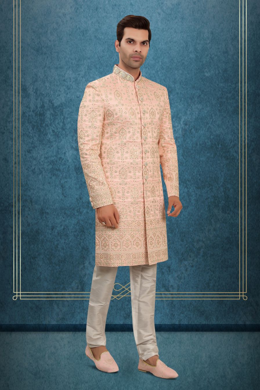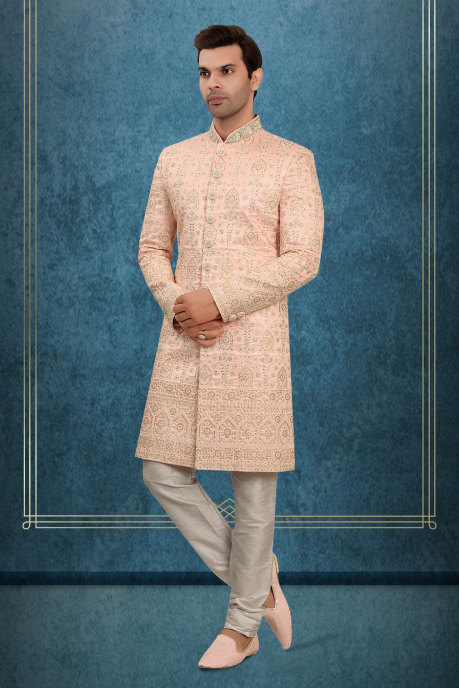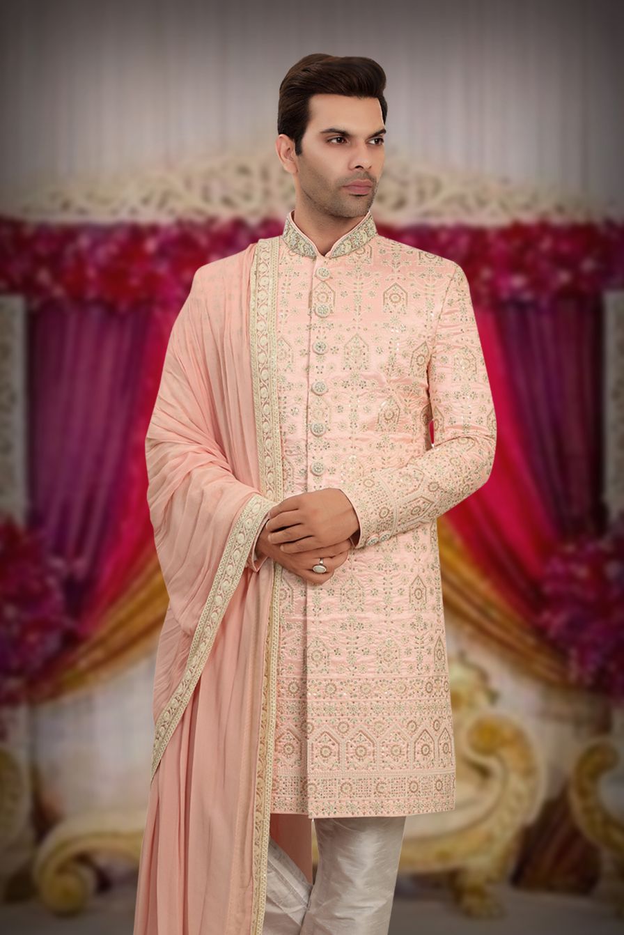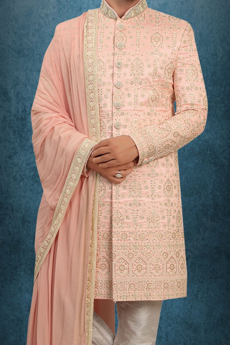 Blush Pink Embroidered Silk Sherwani Set with Matching Dupatta and Intricate Thread Work