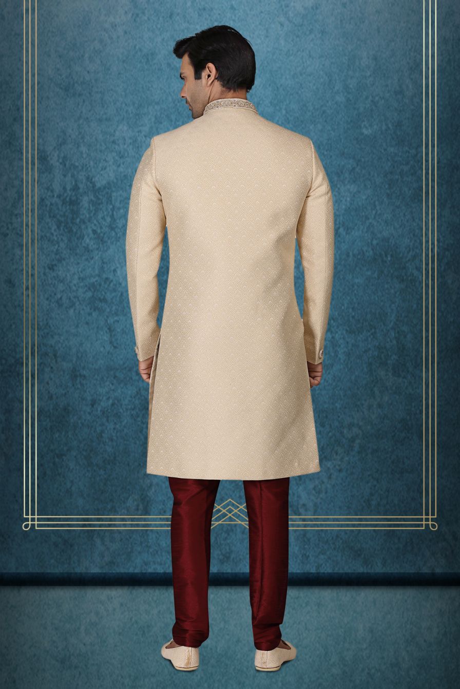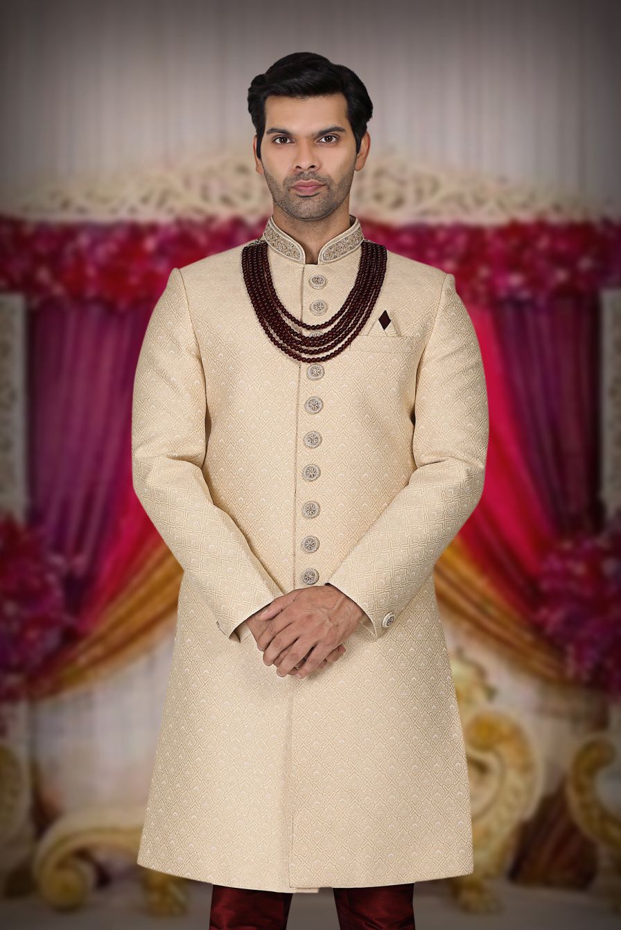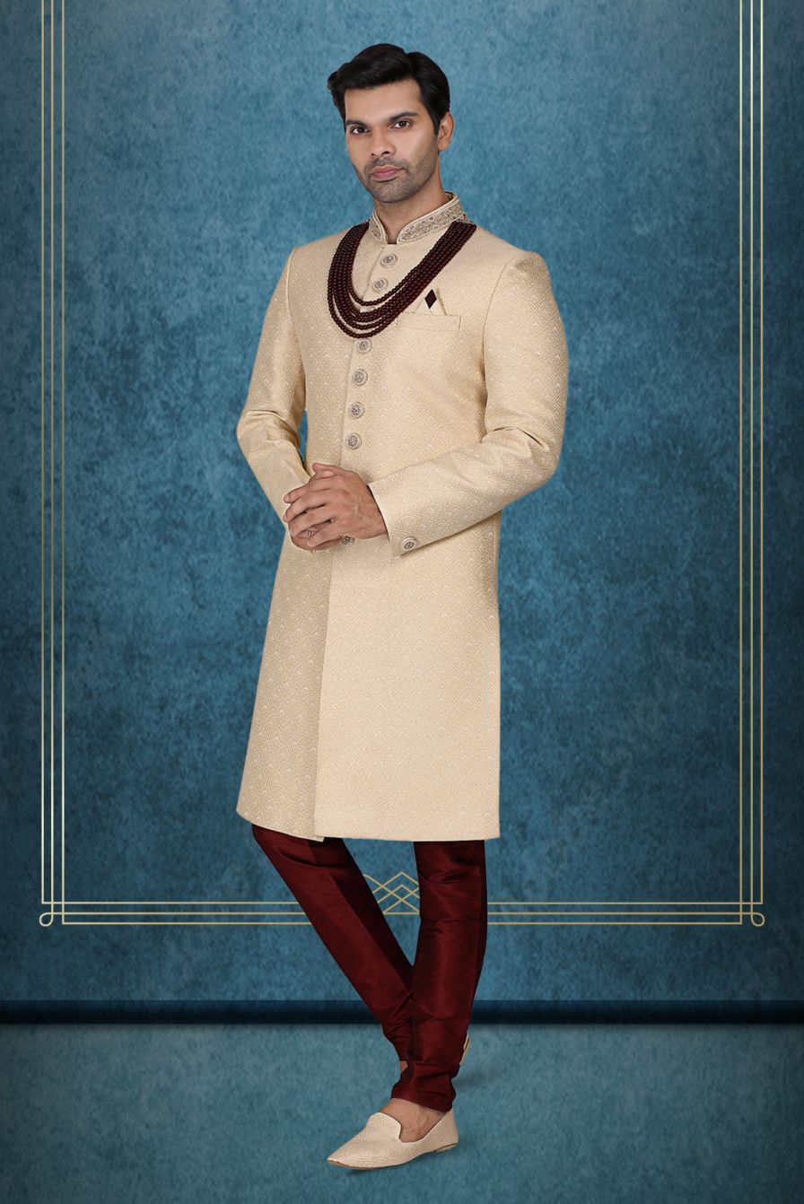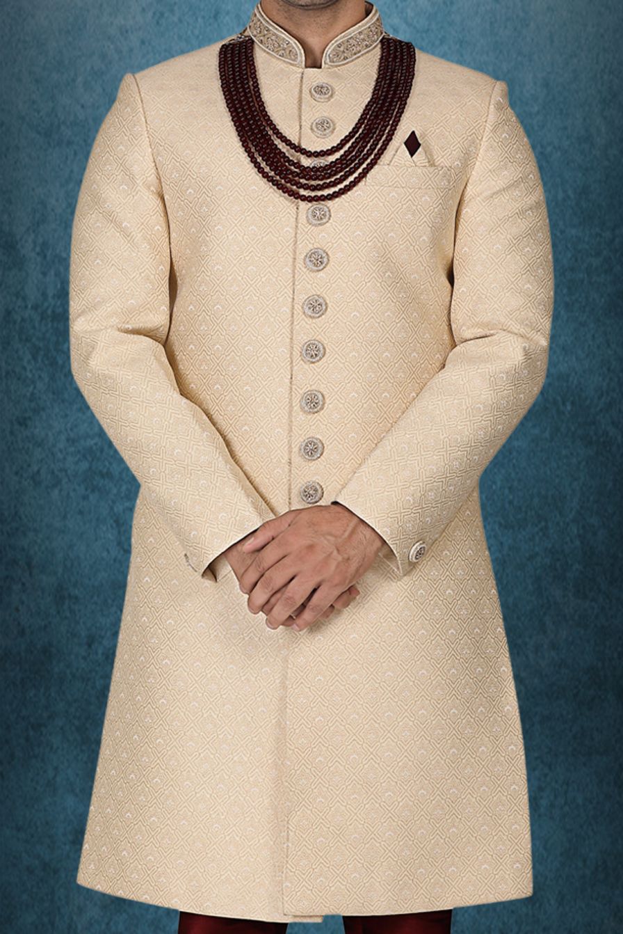 Classic Cream Textured Sherwani with Maroon Beads
