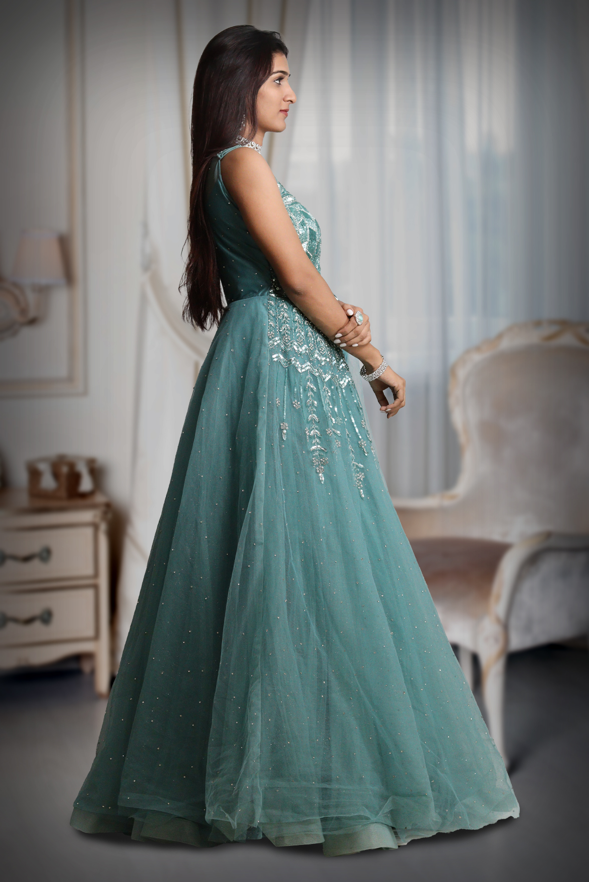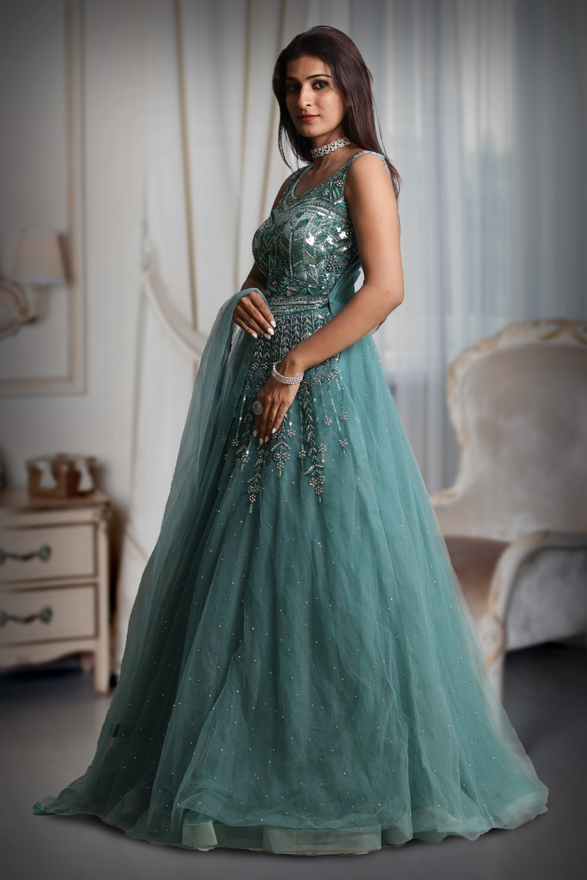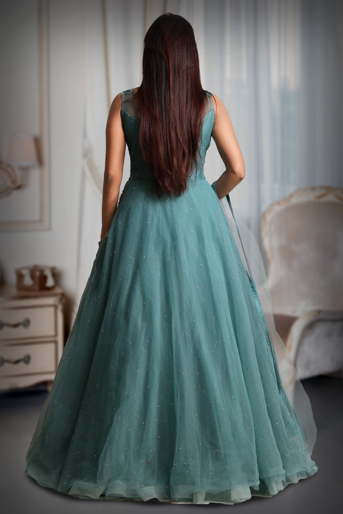 Cyan Blue Sleeveless Net Gown