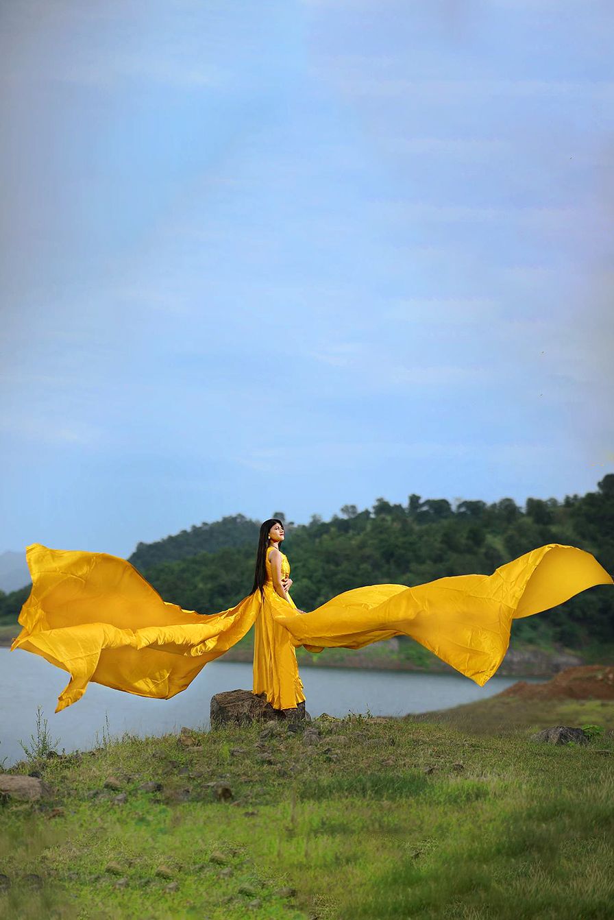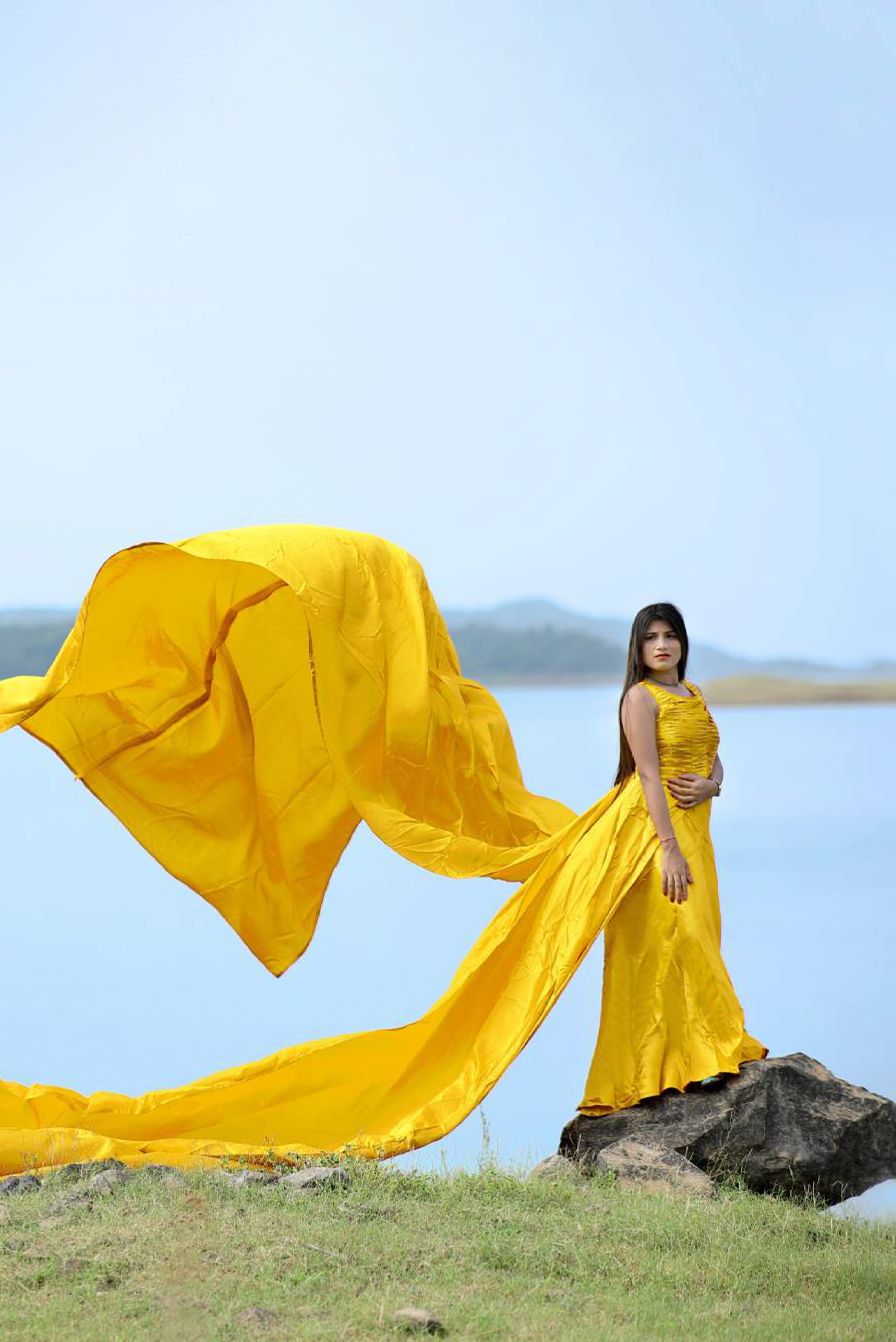Golden Yellow Double Panel Tail Satin Gown