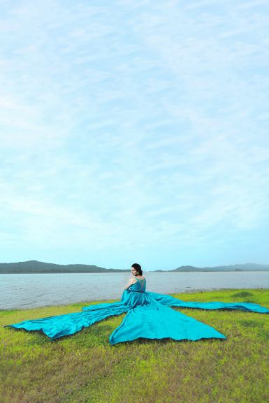 Iris Blue Three Panel Tail Satin Gown