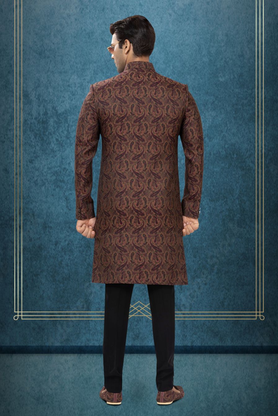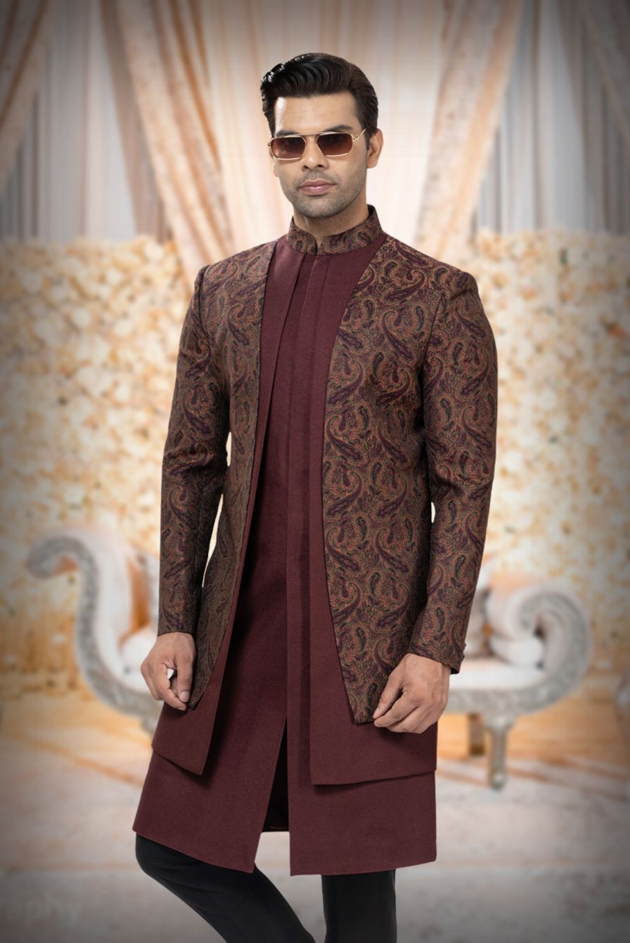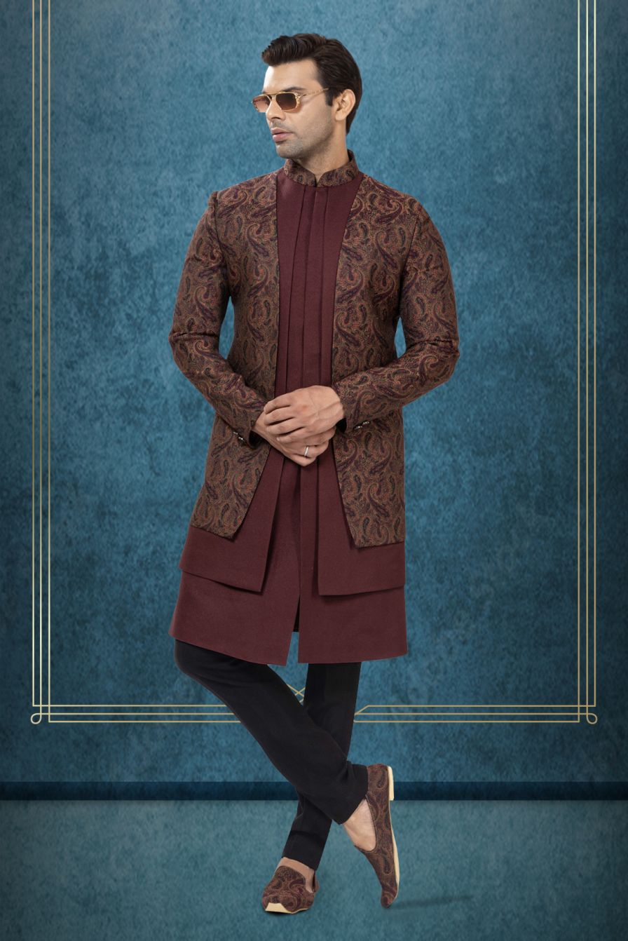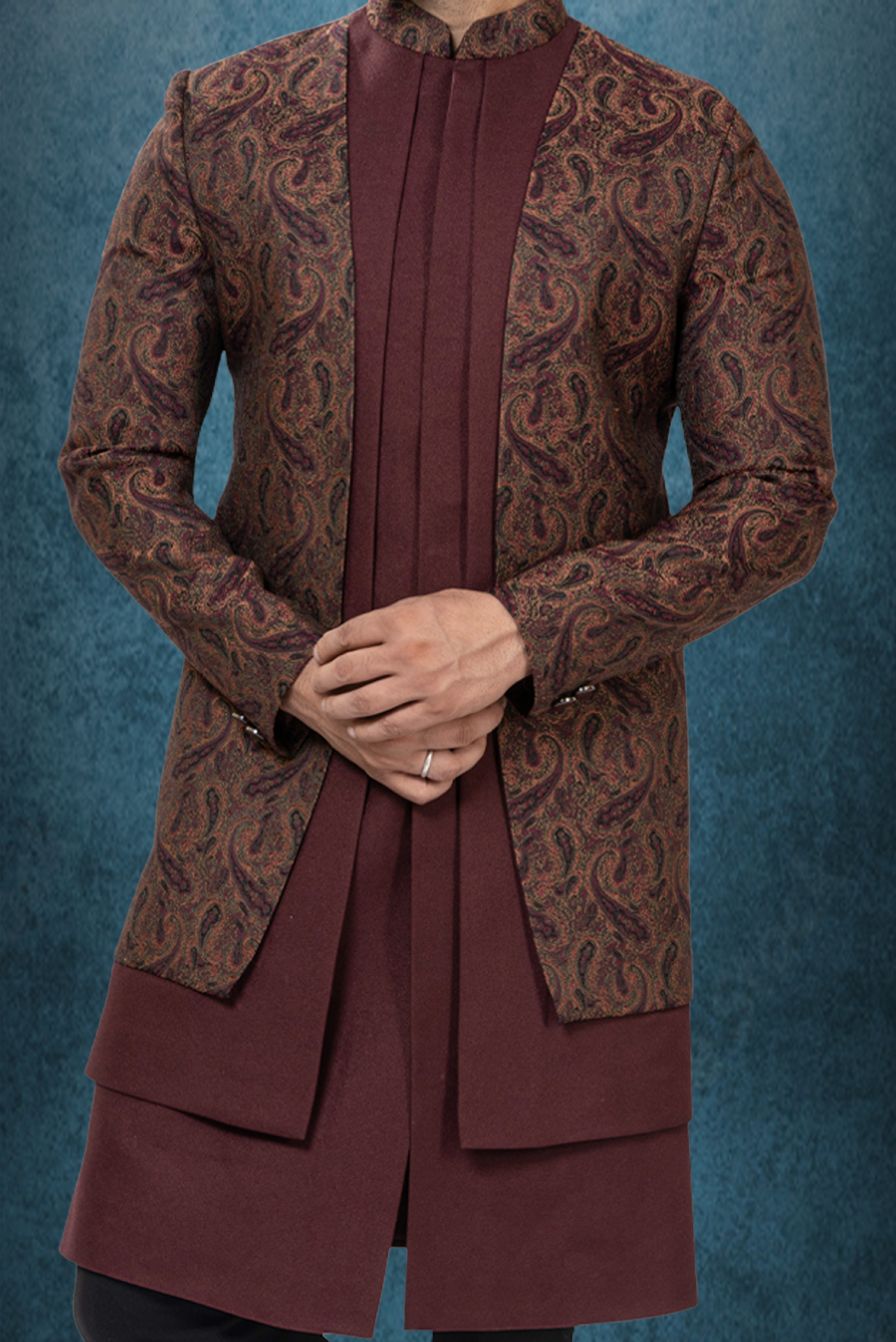 Maroon Silk Kurta with Brown Paisley Brocade Indo-Western Sherwani