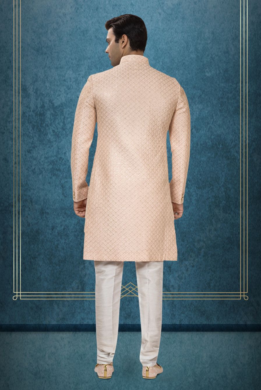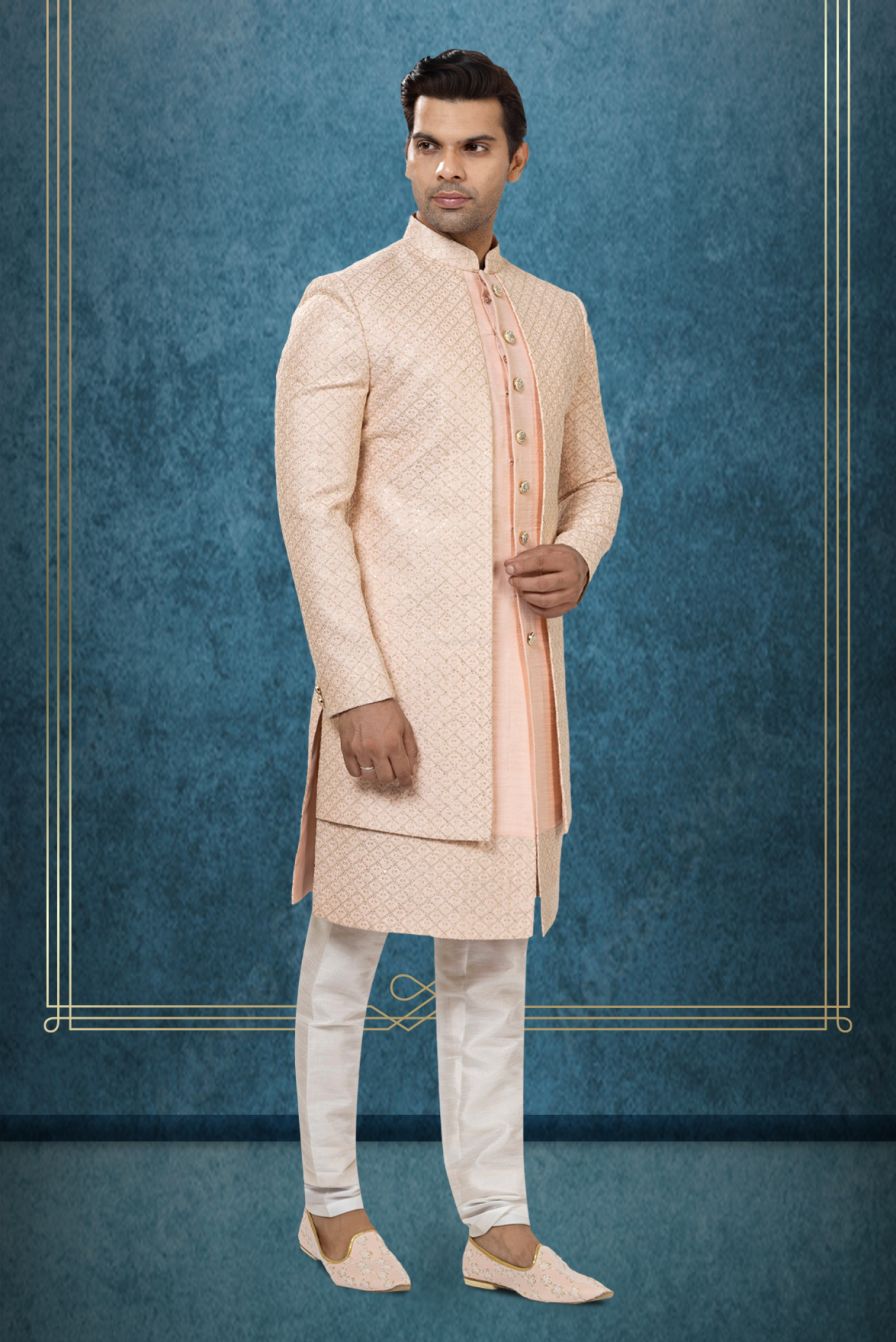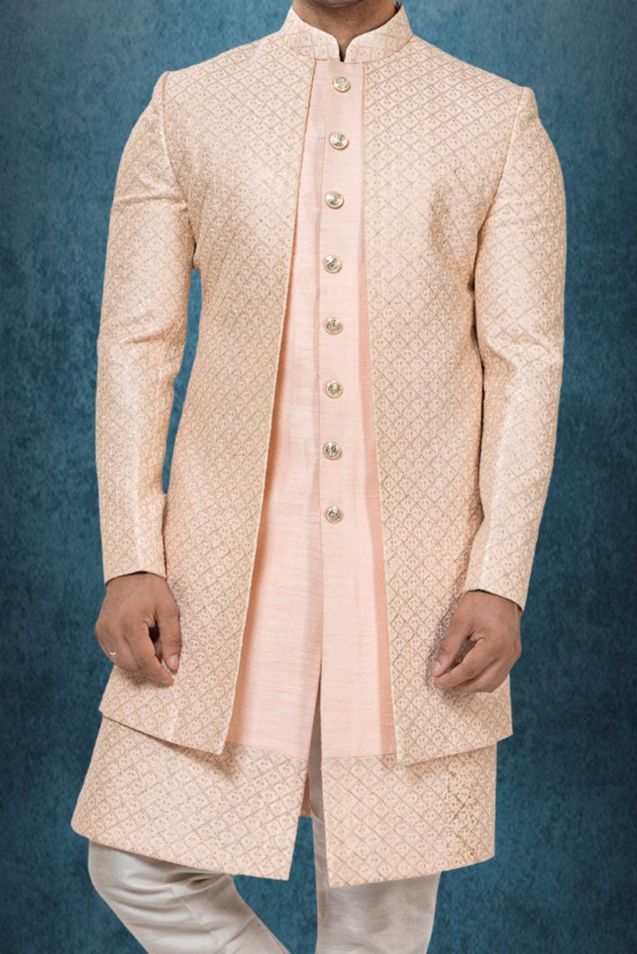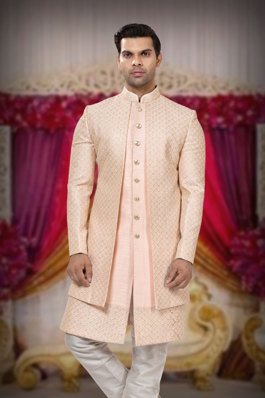 Peach Brocade Layered Sherwani
