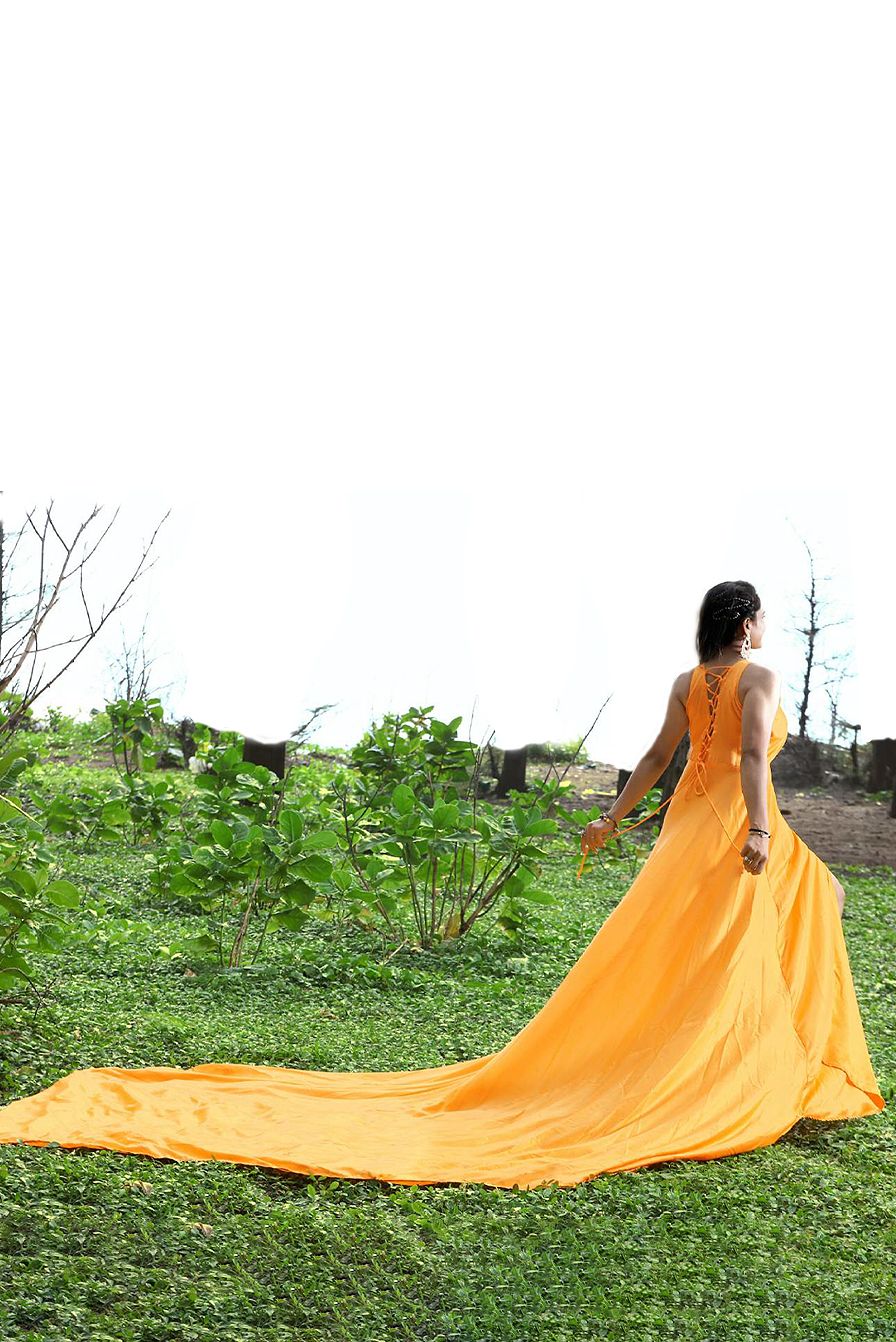 Tangerine Yellow Twist pleated Yoke Satin Gown